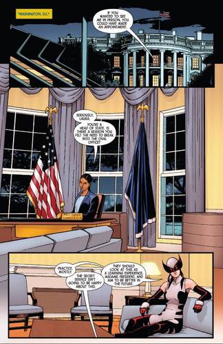 A Marvel lançou recentemente nos EUA o arco Old Woman Laura, publicação que mostra a vida da X-23 em um futuro próximo. Na HQ, a Wolverine visita a Casa Branca, onde ela encontra uma antiga amiga como presidente dos EUA: Kamala Khan.