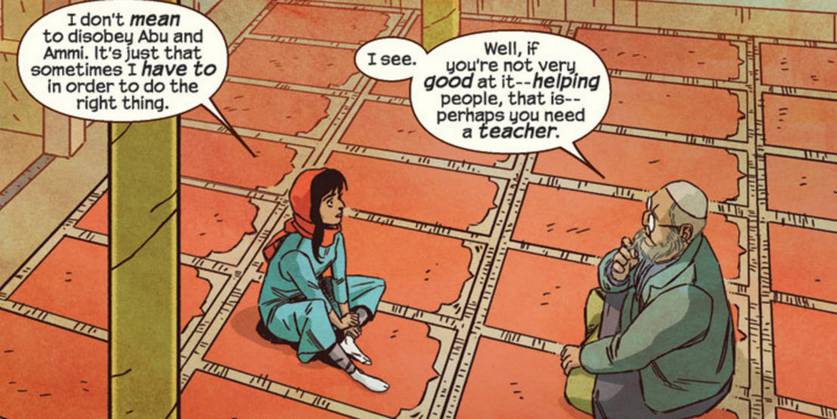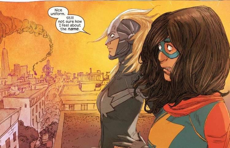O fato de ser uma Inumana nunca influenciou muito Kamala, mas sua devoção à Capitã Marvel sempre fez diferença em sua vida. Mesmo não tendo ligação nenhuma com Carol Danvers, ela decide escolher o nome de Ms. Marvel pois sempre viu a heroína como inspiração. Eventualmente elas acabaram se conhecendo e Danvers assume o papel de mentora da jovem heroína – que chegou até a se decepcionar com ela por conta da Guerra Civil 2 .
